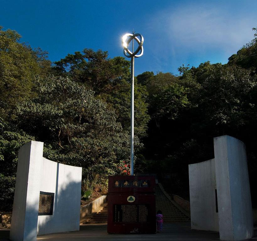 位於埔里鎮虎頭山麓,緊鄰埔霧公路及埔里高工旁。故蔣經國總統曾提「山清水秀」四字於其上,碑體造型美觀而雄壯 ,由兩面白色弧牆環抱,中間碑座為三米高之赭色屏牌,上豎一柱不銹鋼桿,最上端頂著兩偭相交的圓環,整個造型如一朵半開的百合花,是具有地理性意義的遊覽勝地。